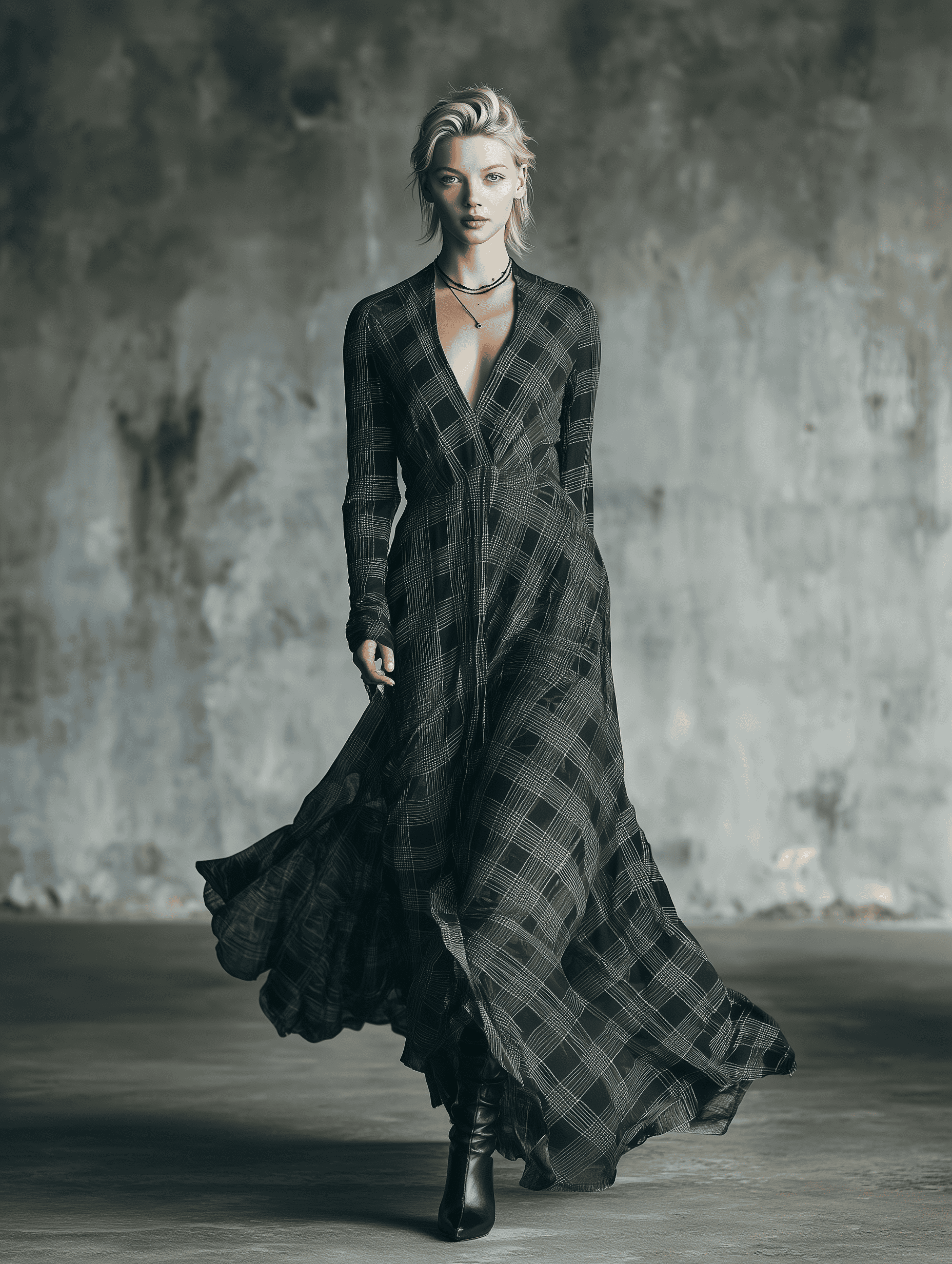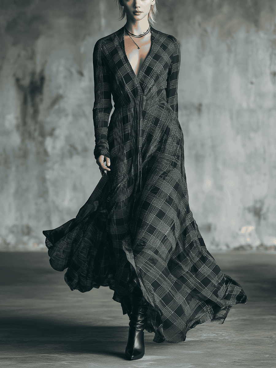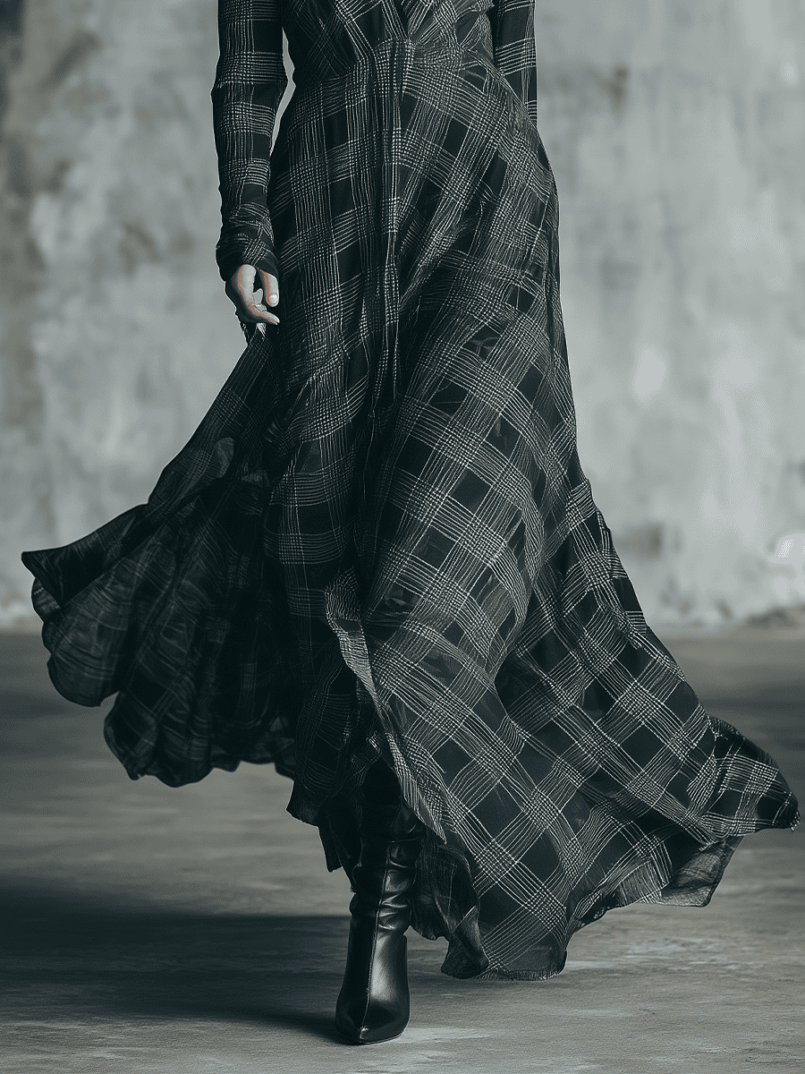 The black and gray check pattern adds subtle texture and visual interest, giving the dress a modern, versatile appeal. Its maxi length flows gracefully, providing a polished finish whether you’re at a casual outing, evening event, or formal gathering.