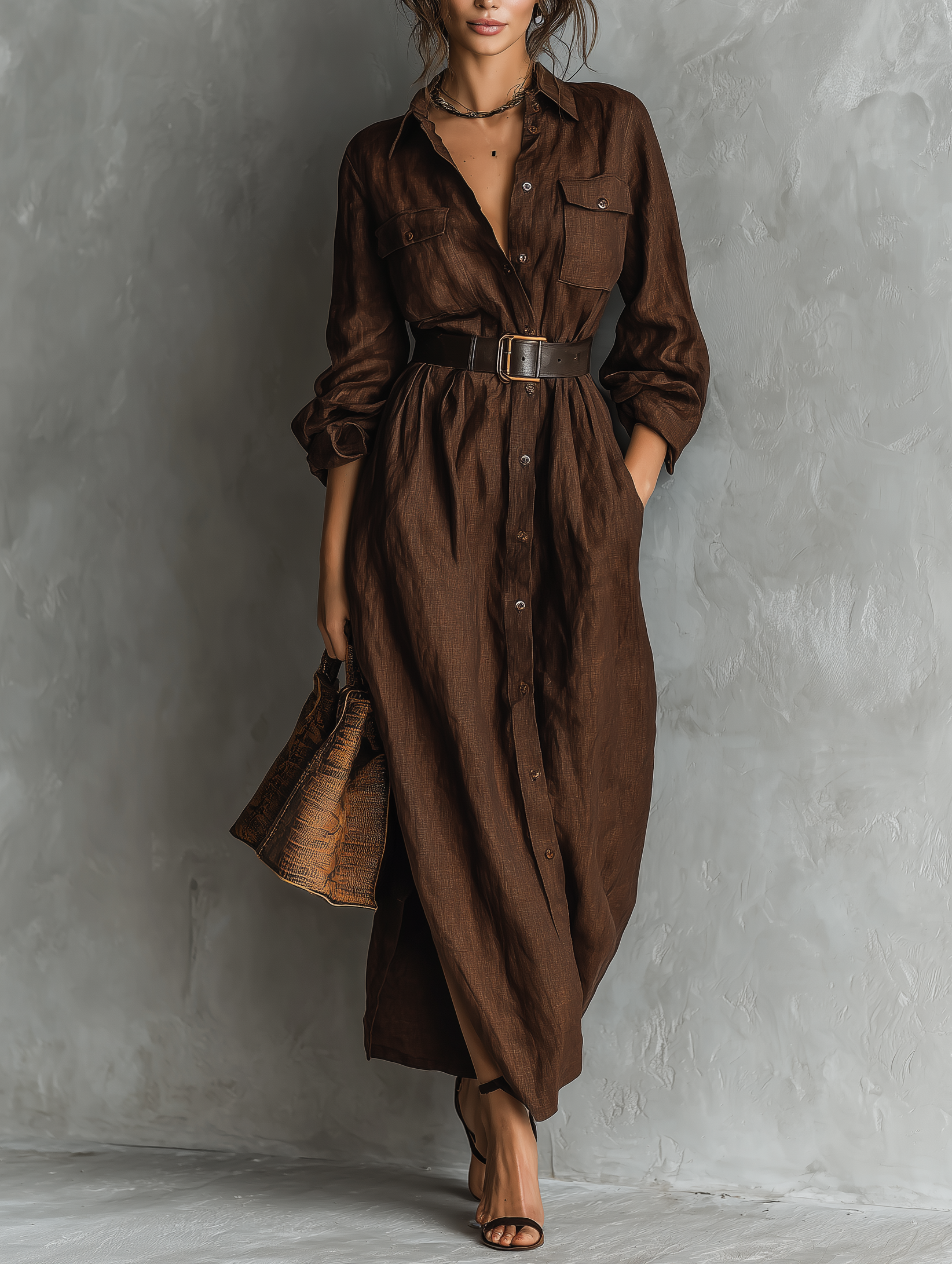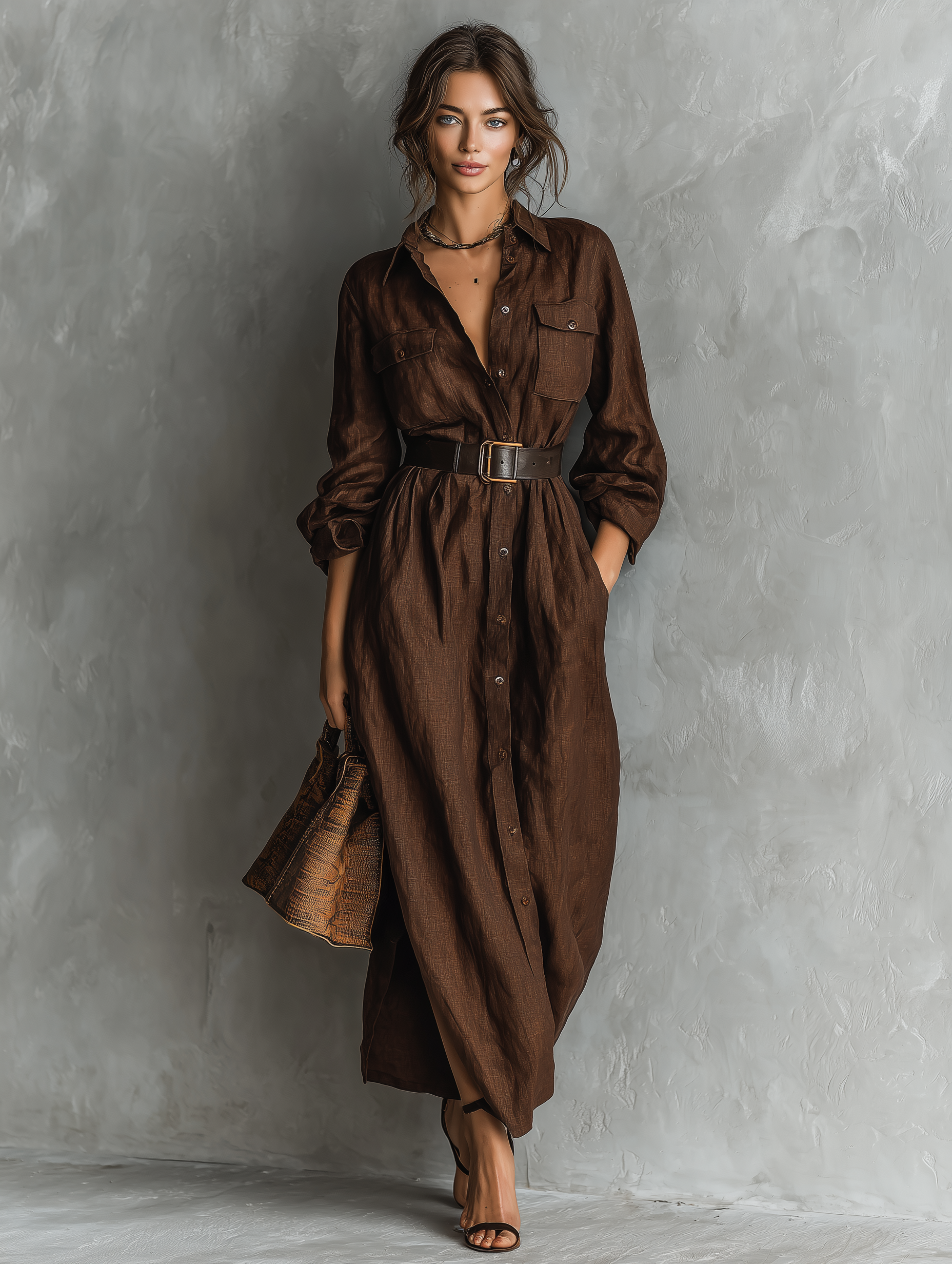 Here’s the thing: this brown shirt dress is a timeless combination of style, comfort, and versatility. Its relaxed, loose-fitting silhouette creates a flattering shape, while the waist belt adds subtle definition and emphasizes femininity. What this really means is a polished look without feeling constrained.